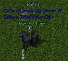 I recommend GM Hiding, GM Stealthing, GM Lockpicking (make tons of gold opening dungeon chests), GM Detecting Hidden, GM Remove Traps, GM Stealing (so you can steal sigils) Magery (70.1, never fail Recall) and Tracking (29.9, locate enemy thieves for your allies). Your main method of defense will be hiding and stealthing and relying on your allies. You won't kill many people, but I try using wands of lightening (check the pic above before laughing!). An ethereal mount so you don't lose your horse everytime you need to stealth would be an excellent piece of equipment. I also carry the following 'newbie items': Newbie Clothes, Newbie Lockpicks, Runebooks with lots of charges and full of useful faction related locations, A Boat, Faction Trap Removal Kits, Faction Trap Deeds and Newbie Hatchet (for chopping enemy blocking items). I pick up reagants that I find on the ground, but mostly I require no resources and rarely leave anything for the enemy to gain.